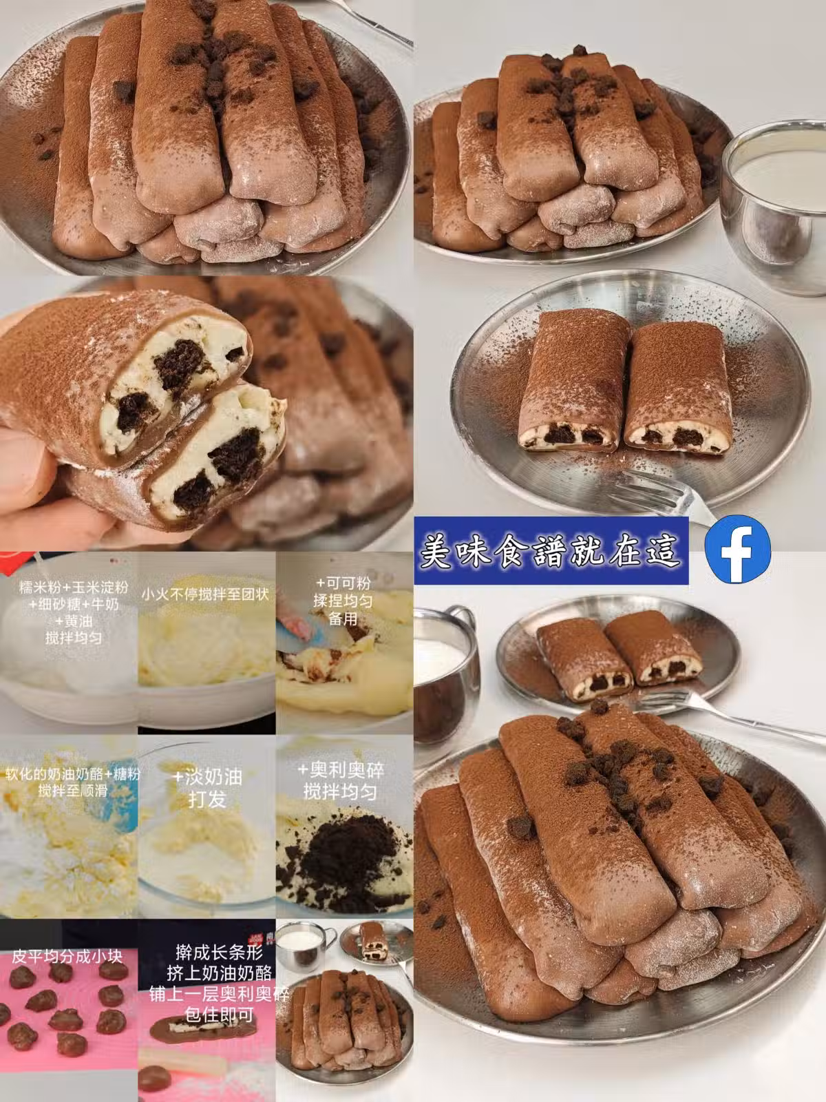 4⃣️ 皮平均分成小塊,擀成長條狀,擠上奶油奶酪,鋪上一層奧利奧碎,包住即可