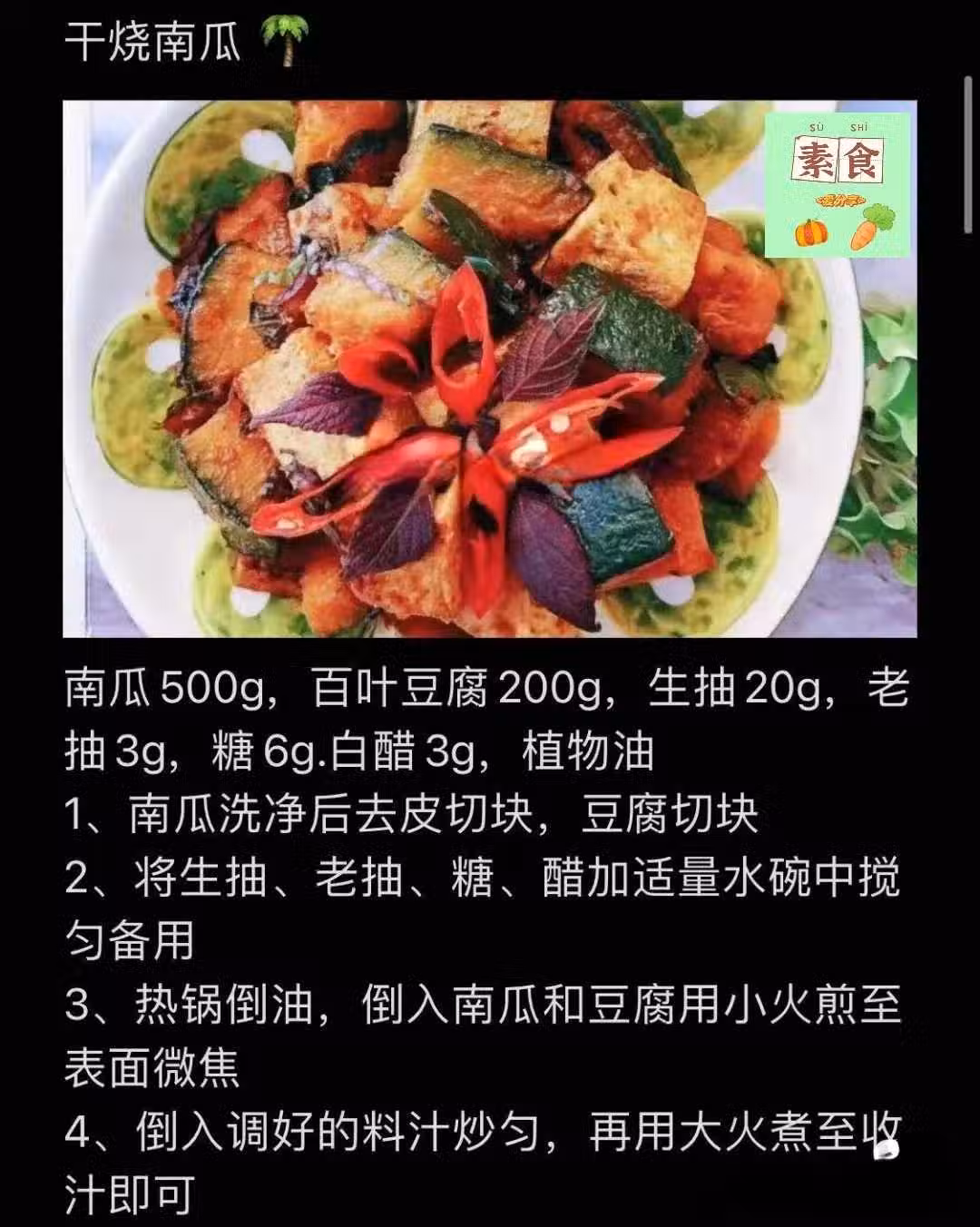南瓜500g,百葉豆腐200g,生抽20g,老抽3g,糖6g.白醋3g,植物油