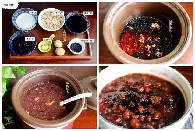 補血八寶粥:桂圓、紅棗、黑米、薏米、花生、糯米、紅豆、腰豆、銀耳、百合干,適量抓取即可