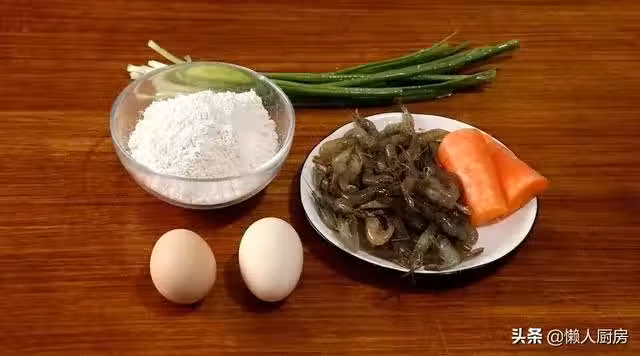 小河蝦,2個雞蛋,胡蘿蔔,蔥,麵粉,油,鹽。