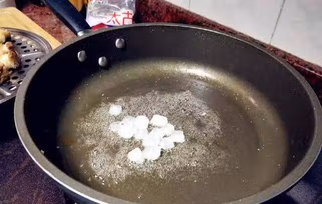 熱鍋起油炒嫩糖色(目的為了使顏色呈金黃色,糖色炒老了顏色會深,甚至發苦)。加入白冰糖炒至剛開始糊化的時候加入開水。(即為白冰糖融化後變色大泡時)。