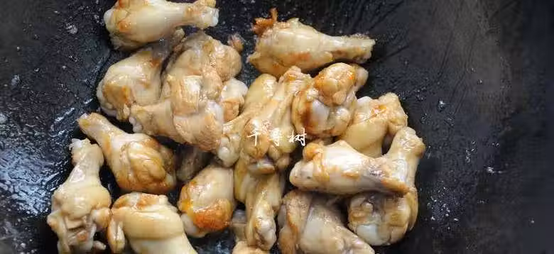 9. 將雞翅根下鍋轉大火迅速翻炒,力求每個翅根上面都能粘上糖色。