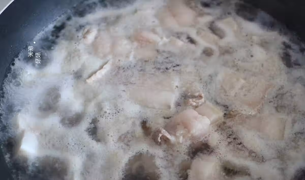 3,再將五花肉用清水沖洗乾淨,瀝干水分。經過焯水和清洗處理的五花肉可以起到很好的去腥效果。