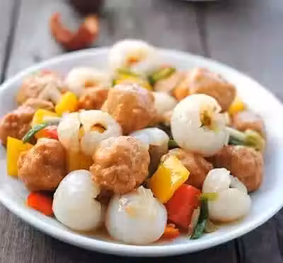 5、放入荔枝肉、丸子,將花椒粉、雞精、鹽、蚝油、水澱粉調成汁倒入;