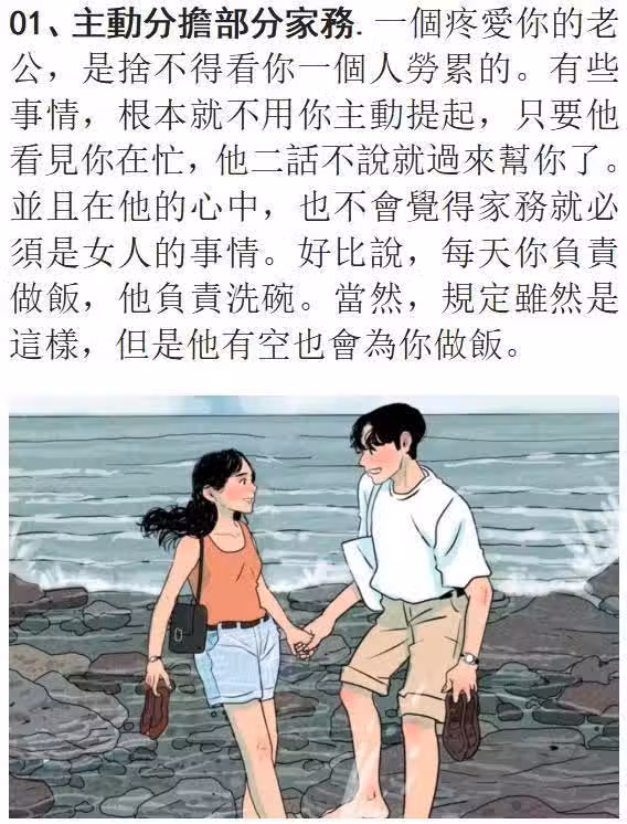 01、主動分擔部分家務。一個疼愛你的老公,是捨不得看你一個人勞累的。有些事情,根本就不用你主動提起,只要他看見你在忙,他二話不說就過來幫你了。並且在他的心中,也不會覺得家務就必須是女人的事情。好比說,每天你負責做飯,他負責洗碗。當然,規定雖然是這樣,但是他有空也會為你做飯。