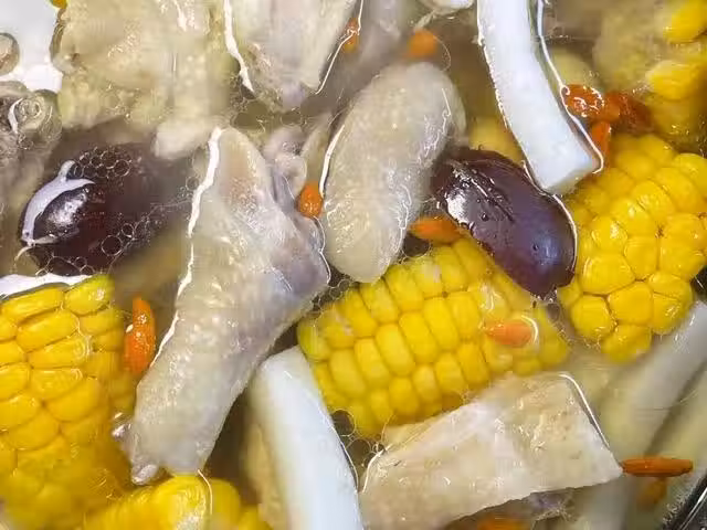 準備食材:玉米,椰子,雞肉,薑片,紅棗,枸杞子。