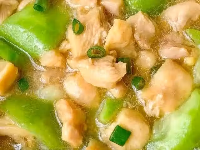 1、絲瓜削掉外皮,清洗乾淨後切成小塊。雞腿去皮去骨頭,清洗乾淨後切成小塊,再加入薑絲、醬油、澱粉和食用油,抓拌均勻腌制十五分鐘。