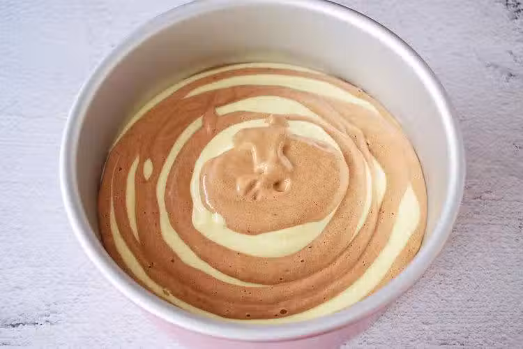 11、一勺原味麵糊糊加入一勺巧克力麵糊糊,這樣可以製作出斑馬紋蛋糕,然後將蛋糕中的氣泡震出來,味道會更加好。