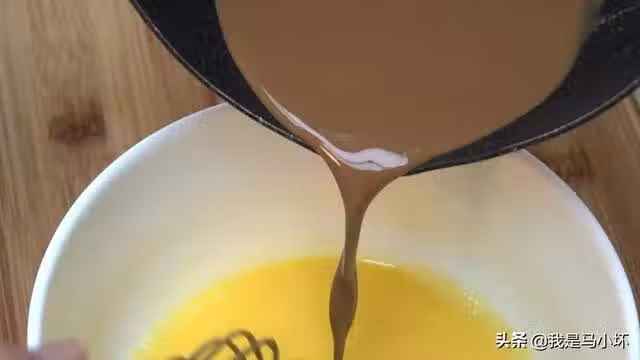 4、雞蛋打散後就把剛才調好放涼的黑糖牛奶加進來,攪拌均勻。