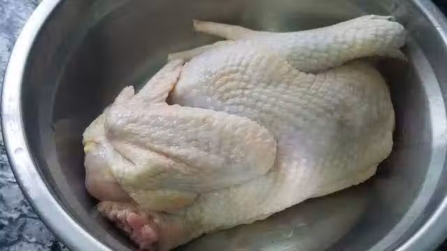 3.把做好的調料,倒在瀝干水分的雞身上,然後用手把調料均勻的塗抹在雞身上,腌制1個小時以上,方便入味。