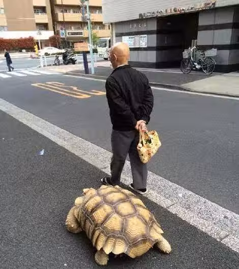 大家都知道,日本動漫《七龍珠》里的角色,龜仙人。龜仙人留著白鬍須,是和藹好動的老人形象,時常戴著太陽眼鏡,日常生活中衣服穿得很花哨,有時背後也會掛著一個龜殼。除了動漫里的龜仙人,現實當中也有一個龜仙人。日本東京有一個老爺爺在街頭遛烏龜,被網友們稱是現實版龜仙人。