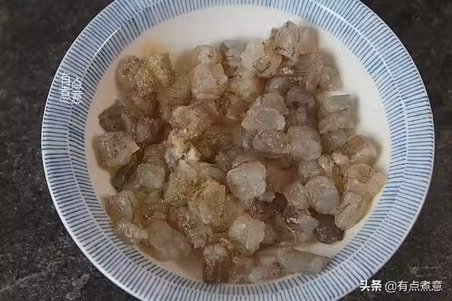 4、把鮮蝦去頭去尾,剝掉蝦殼,挑掉蝦線,然後將蝦仁沖洗一下,用廚房紙將蝦仁表面的水吸干,放入少許鹽、料酒和胡椒粉腌制5分鐘。(因為我買的蝦比較大,所以把蝦仁切成小粒了,如果你用的蝦仁比較小可以不切。)