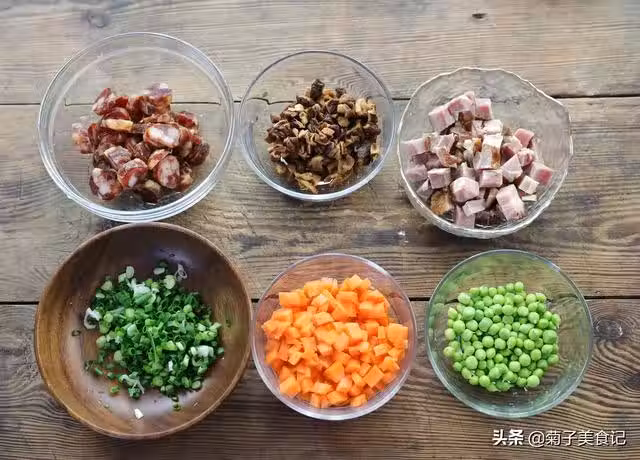 起鍋下油燒熱,先放入臘腸臘肉炒至透明出香味。再接著放入胡蘿蔔丁,蝦仁香菇碎和豌豆仁,調入蚝油再炒2分鐘即可。