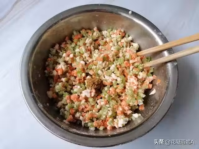 第四步:用筷子把菜和麵粉攪勻,然後再放入五香粉和鹽,再調勻入味,加了鹽之後芹菜會出一些湯汁,所以拌麵粉的時候不需要加水。