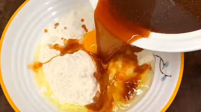 第二步:另取一個碗,加入300克普通麵粉,打入一個公雞蛋,再倒入化開的紅糖酵母水,用筷子順著一個方向拌勻。