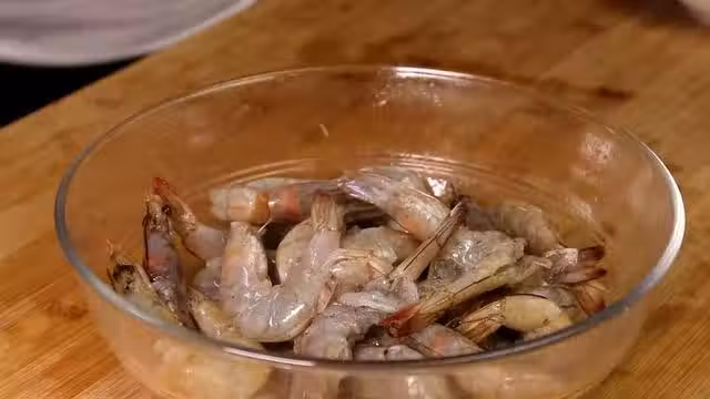 2、腌制大蝦:在大蝦中放點鹽,來點胡椒粉,放點料酒,給它抓拌均勻腌一會兒,下面蝦上裹層澱粉,蝦皮蝦肉上面都裹層澱粉,薄薄的一層就可以了