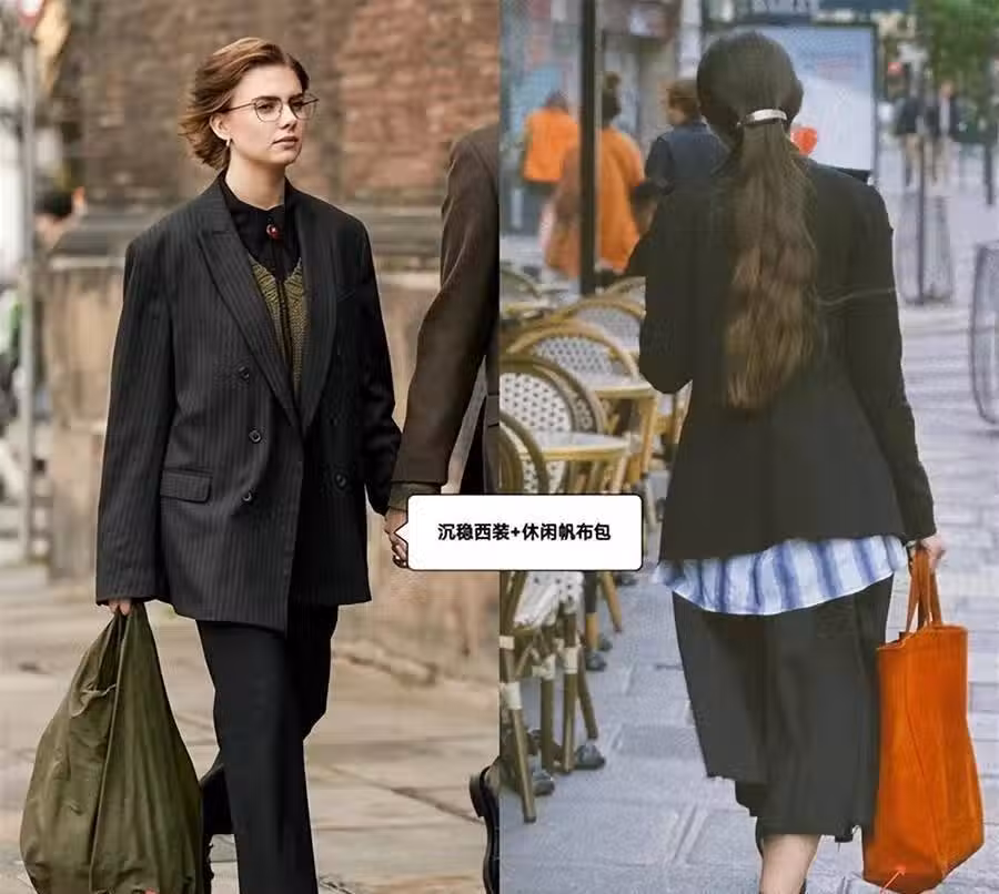 在法國女人眼裡, 沉穩利落的西裝和休閑的帆布包之間的風格反差最具魅力。或是硬挺西裝配有褶皺的軟帆布包,或是黑西裝配彩色帆布包,都能給嚴肅的搭配帶來青春活力。