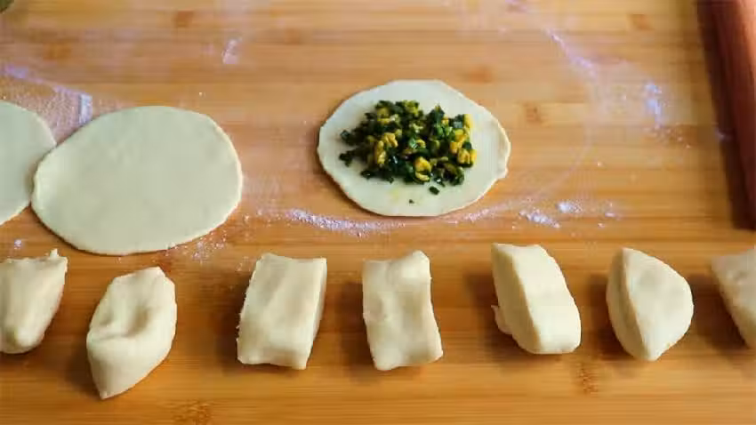 3.把麵糰整理成長條,切成一樣大的面劑子,因為這個是燙麵的,所以不用餳面,直接就可以做,把面劑子整理一下,揉圓後壓扁,用擀麵杖擀成圓餅,放進餡料,這個餡料不能放得太多,餡兒多了烙的時候容易開裂。