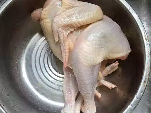 2、將切好的姜蔥蒜塞入雞的肚子裡面,可以更好地入味,然後用保鮮膜裹好,放入冰箱腌制一個晚上;