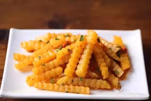 1.土豆去皮清洗乾淨,切為厚度約一厘米的片,用特製刀具切成波浪形長條。土豆切好放入清水中除去澱粉。