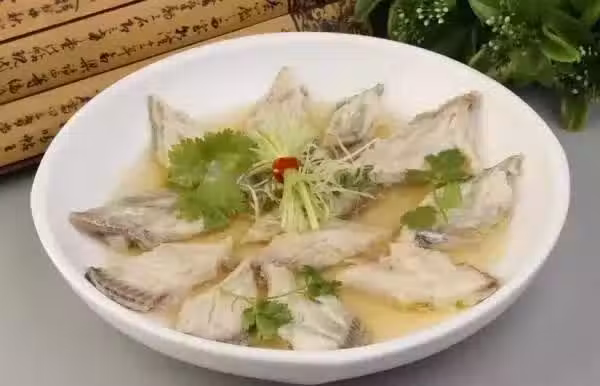 7、倒入蒸魚盤中的湯汁燒開,撒上蔥絲和香菜末,澆入蒸好的帶魚上。