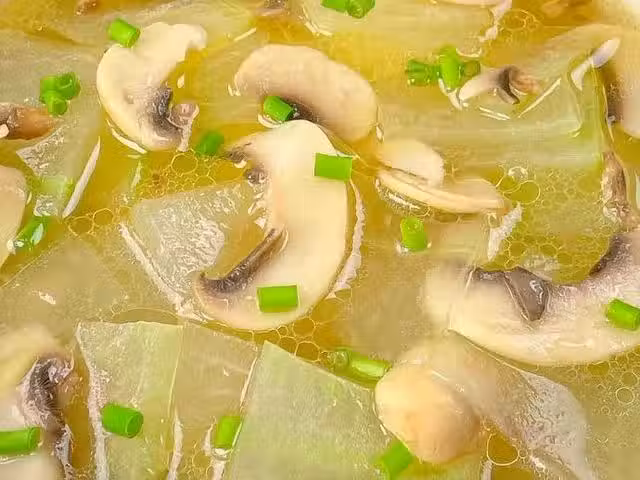 4、冬瓜和口蘑都煮熟之後,加入適量的食鹽和胡椒粉調味,攪勻煮入味,撒上蔥花即可出鍋開吃。