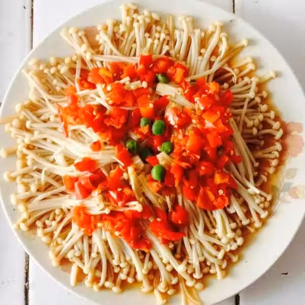 1.金針菇剪去根部,洗凈瀝水,擺在盤中