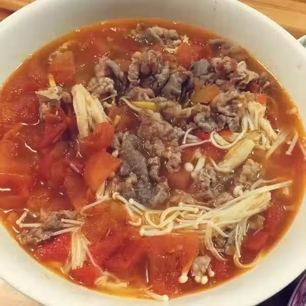 主料:肥牛150克、金針菇100克、西紅柿3個、油菜(小)4顆、食鹽3克、蔥1段、姜2片、泡椒2個、橄欖油1/2湯匙、水650毫升