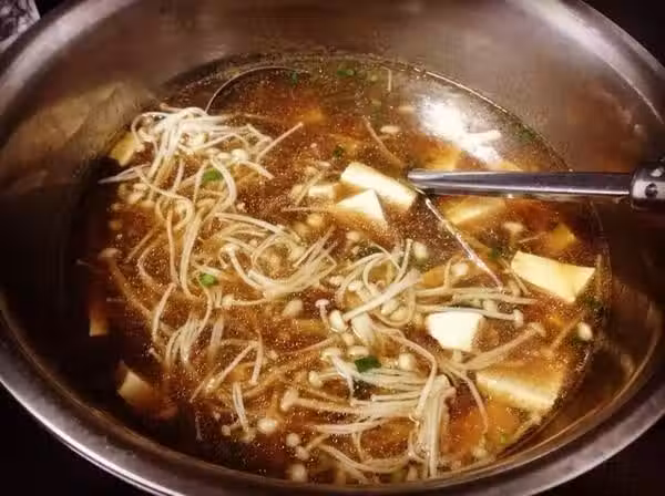 3.鍋里加清水,加入薑片,大火煮開後放入豆腐和金針菇