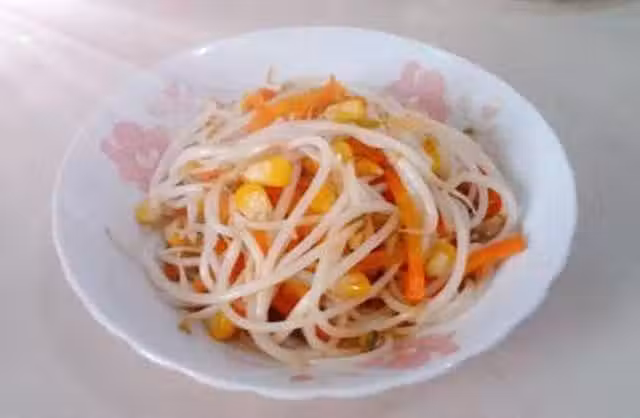 1.綠豆芽用流動的水沖洗乾淨,胡蘿蔔切絲兒,玉米剝好。