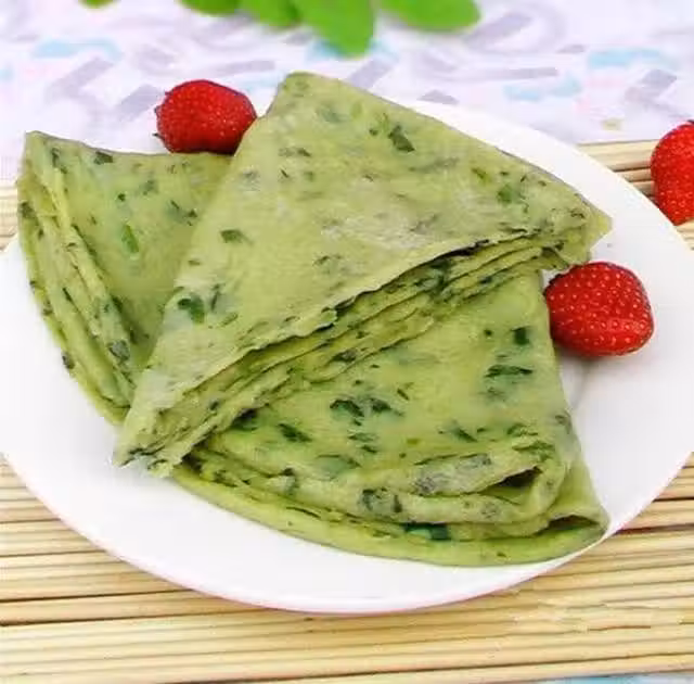 10.電餅鐺加熱刷油,把菠菜麵糊倒進去烙熟,一面差不多了翻面。