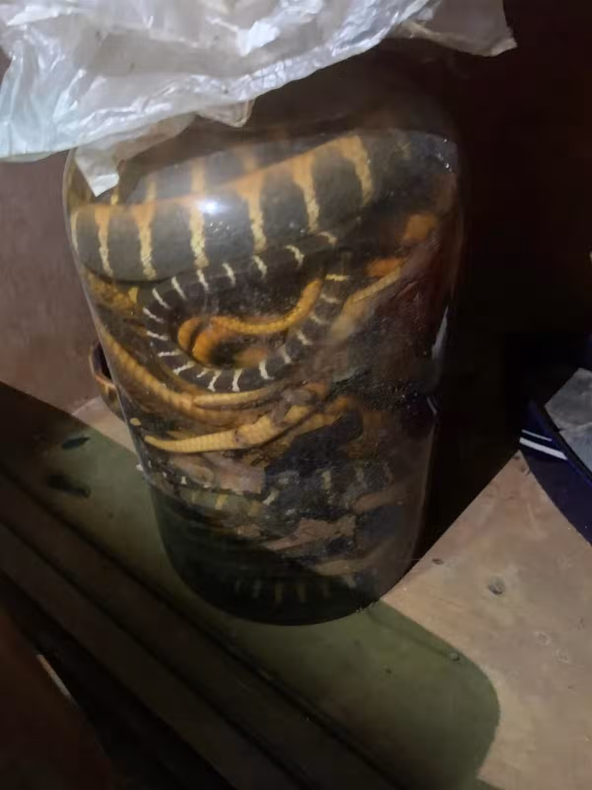 近看玻璃桶可以發現裡面塞滿了大大小小的毒蛇,種類包括眼鏡蛇、雨傘節、龜殼花等,目測數量至少10多條,且尺寸都不小,交纏的畫面看起來十分獵奇詭異...還有眼尖網友發現有一隻蛇竟好像奮力抬頭衝出水面,因此警告原PO:「小心頭部沒浸泡到酒的那一隻,這樣活著的機會是有的」、「我爸一個朋友開20年蛇酒,結果被咬了」、「瓶中還有空氣要小心」