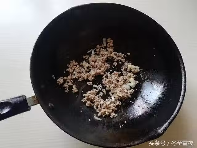 5.鍋內添加少許油,下入蔥花、薑末炒香,下入肉末翻炒,將肉末翻炒至顏色變白