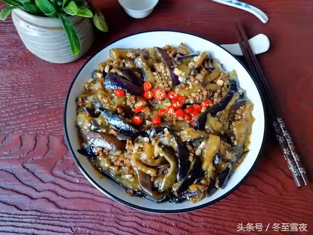 小貼士: 茄子切好後加少許鹽腌制,炒制時就不會吸收太多的油,吃起來不會油膩,腌制時已經加鹽了,燒制時鹽要少放,或者不放,蒜末後放,會為菜肴提味。由於茄子屬於寒涼性質的蔬菜,因此,身體有消化不良、容易腹瀉、脾胃虛寒、便溏癥狀的孕婦朋友不宜多吃