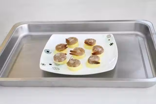 8、接通蒸箱的電源,選擇蒸菜功能,溫度設定為100度,先預熱好蒸箱,然後將裝有蝦仁豆腐的蒸盤放入蒸箱,設定時間為10分鐘,設置完成後按啟動鍵