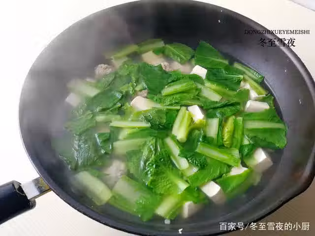 9.放入小白菜,燒開,煮至小白菜顏色變深即可,加入鹽調味,關火,加入白鬍椒粉、香油攪拌均勻,盛出即可