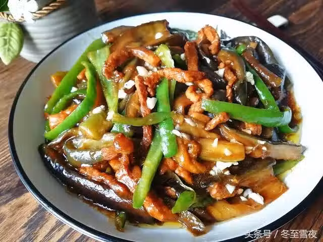 【肉絲尖椒燒茄條】材料:茄子4個、尖椒4個、豬肉100克、油鹽適量、蔥1段、姜1片、大蒜2瓣、生抽1湯匙、老抽1/2湯匙、水澱粉適量