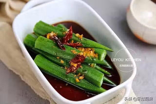 第三步:鍋中倒入適量的水燒開,然後把秋葵放入鍋中,再放入1勺鹽、幾滴食用油燙煮2分鐘,最後把秋葵撈出裝盤。