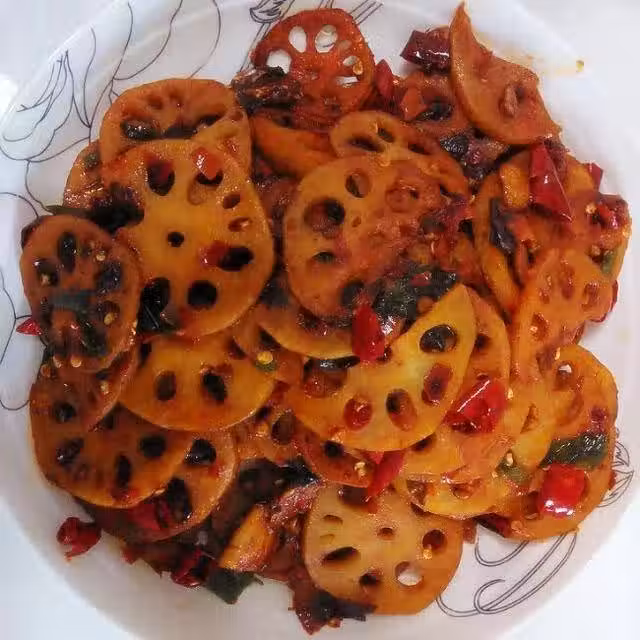 蓮藕削皮後切片水燒開,下藕片煮三分鐘左右倒出藕片,用涼水沖洗起鍋熱油後,放姜、蒜和豆瓣醬煸香煸香醬料後下藕片,將藕片炒至金黃放鹽、糖、生抽炒勻放干辣椒和香蔥,炒勻即可