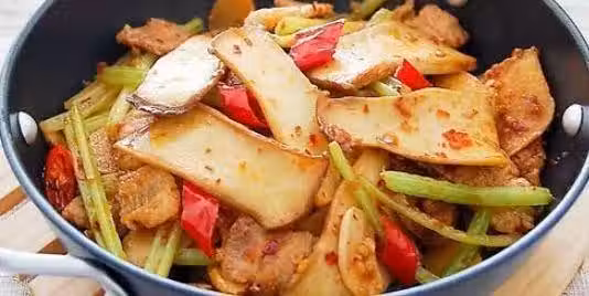 杏鮑菇250克;五花肉70克;芹菜100克;生薑2片;大蒜2瓣;小米椒2個;郫縣豆瓣醬1大勺;生抽2小勺;糖1小勺