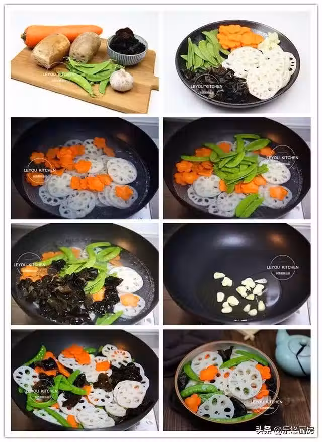 第五步:把木耳放入鍋中焯20秒然後將所有蔬菜一起撈出放入涼水中。因為幾種蔬菜的成熟時間不一樣,所以要分先後放入鍋中。