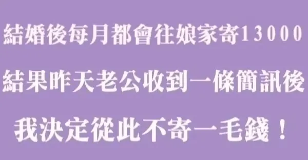 婚後每個月我往娘家寄一萬三千元, 結果看到昨天老公收到的一條簡訊後,我決定從此不寄一毛錢