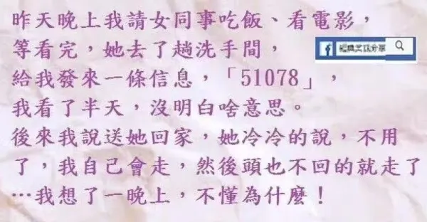 晚上我請女同事吃飯,她去了趟洗手間,給我發來一條信息,「51078」,我看了半天,沒明白什麼意思。