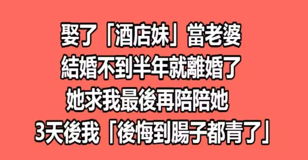 娶了「酒店妹」當老婆!結婚不到半年就失婚了,她求我最後再陪陪她,3天後我「後悔到腸子都青了」