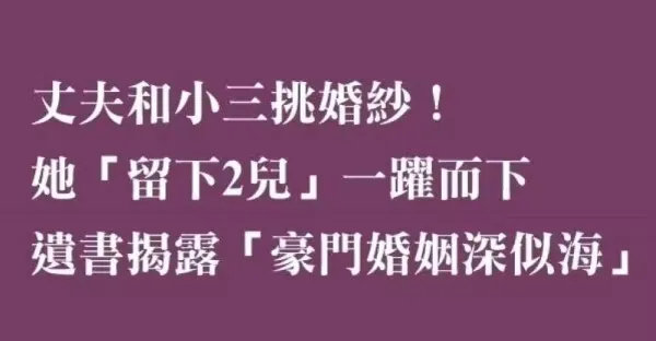 丈夫和小三挑婚紗 !忍耐許久的她「留下2個幼兒」從28樓.一躍而下,遺書揭露「豪門婚姻深似海」