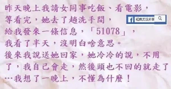 晚上我請女同事吃飯,她去了趟洗手間,給我發來一條信息,「51078」,我看了半天,沒明白啥意思。