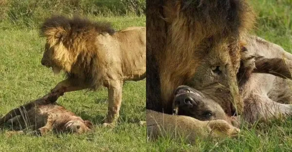 雄獅鎖喉鬣狗一招制敵,把鬣狗翻來覆去調戲,怕他裝死臨走再來一口