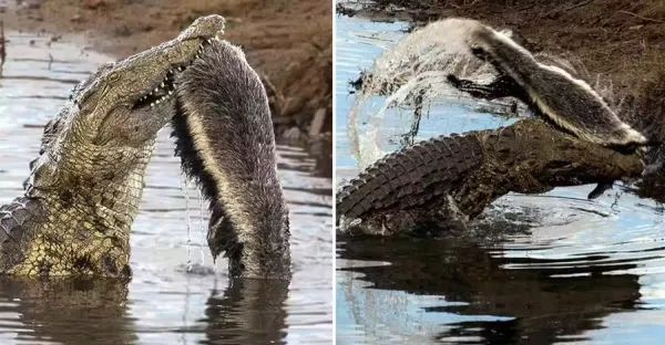 尼祿鱷偷襲勇敢無畏的「平頭哥」蜜獾,東扯西扯成碎片,卻難以下嚥