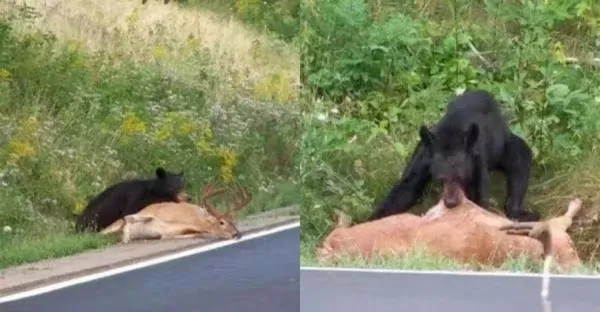 前方熊出沒,黑熊寶寶馬路邊壓倒梅花鹿,二話不說抱著活鹿啃