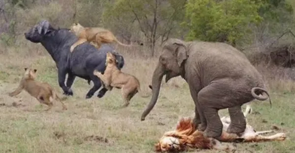 落單水牛被十幾頭獅子撕咬,下一秒卻被大象救下,獅子四處逃命
